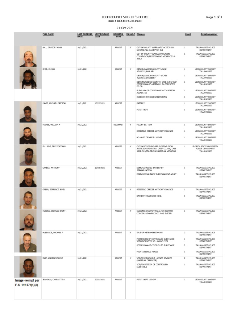 Tallahassee booking report august 2021. WCTV - Below is a PDF file containing all bookings at the Leon County Detention Facility from Oct. LAFAYETTE PARISH SHERIFFS OFC.